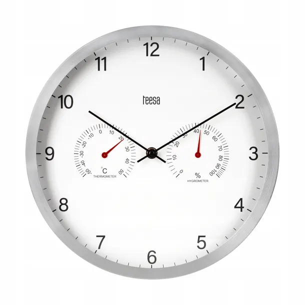 Oprócz precyzyjnego wskazywania czasu, zegar Teesa został wyposażony w praktyczny termometr oraz hydrometr. Dzięki nim w każdej chwili można sprawdzić temperaturę oraz poziom wilgotności powietrza, co jest szczególnie przydatne w domach, biurach czy warsztatach. To doskonałe narzędzie do dbania o optymalne warunki otoczenia, sprzyjające zdrowiu i komfortowi użytkowników.